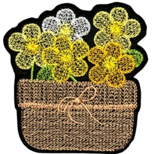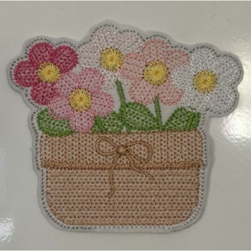Two little pots of spring flowers  have been designed so that the stitches look like knitting – there is a plain back and it can be made as a hanger or attach a magnet and use it on your fridge to hold notes etc.